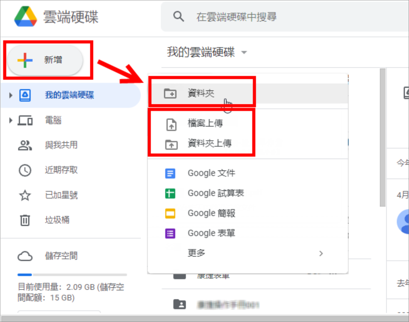 - 點擊「新增」,然後選擇「檔案上傳」或「資料夾上傳」。