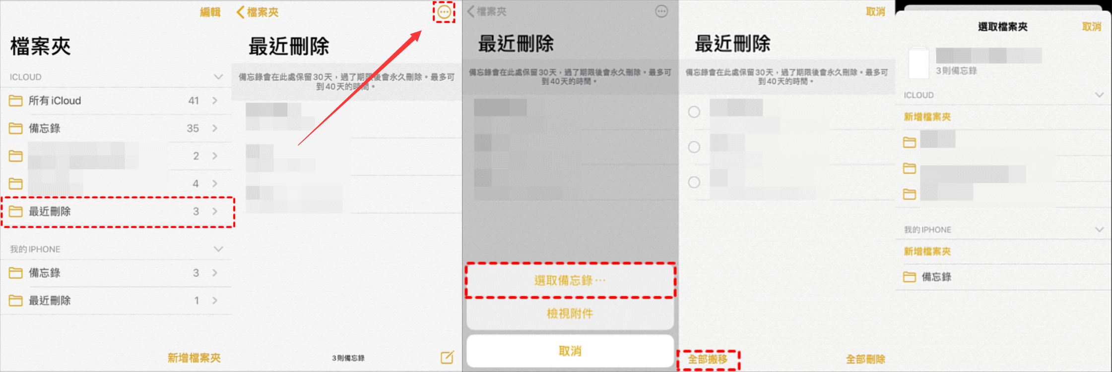 如果您的備忘錄是在過去30天以內誤刪或不見的,那麼您可以嘗試透過 iPhone備忘錄程式的“最近刪除”還原誤刪的備忘錄。但需要注意的是,30天後這些誤刪的iPhone備忘錄會從裝置中移除,無法再透過內建回復功能實現iPhone備忘錄復原。所以如果您想要使用該功能,必須盡快按照以下步驟進行操作: