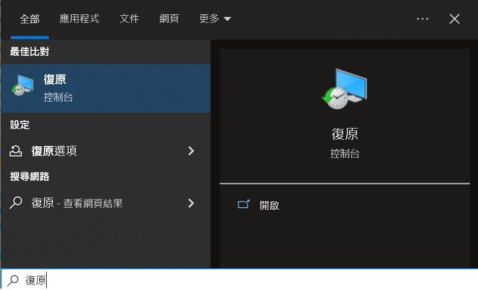 - 使用 Windows 10 搜索功能搜索“復原”並啟動它。
