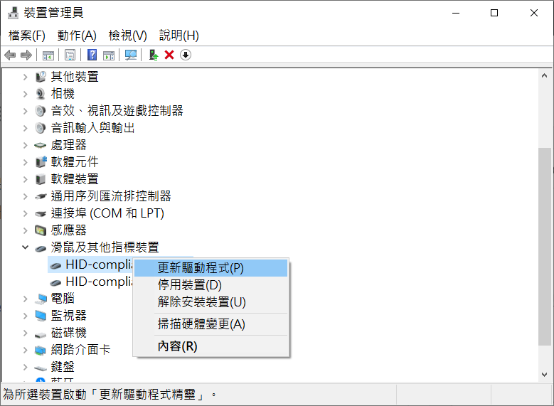 - 如果找不到驅動程式,請回到上一節中的步驟 1 和 2 打開裝置管理員-展開滑鼠及其他指標裝置。