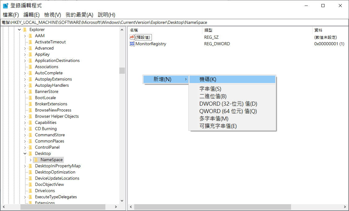 - 導覽至「HKEY_LOCAL_MACHINE\SOFTWARE\Microsoft\Windows\CurrentVersion\Explorer\Desktop\NameSpace」。
